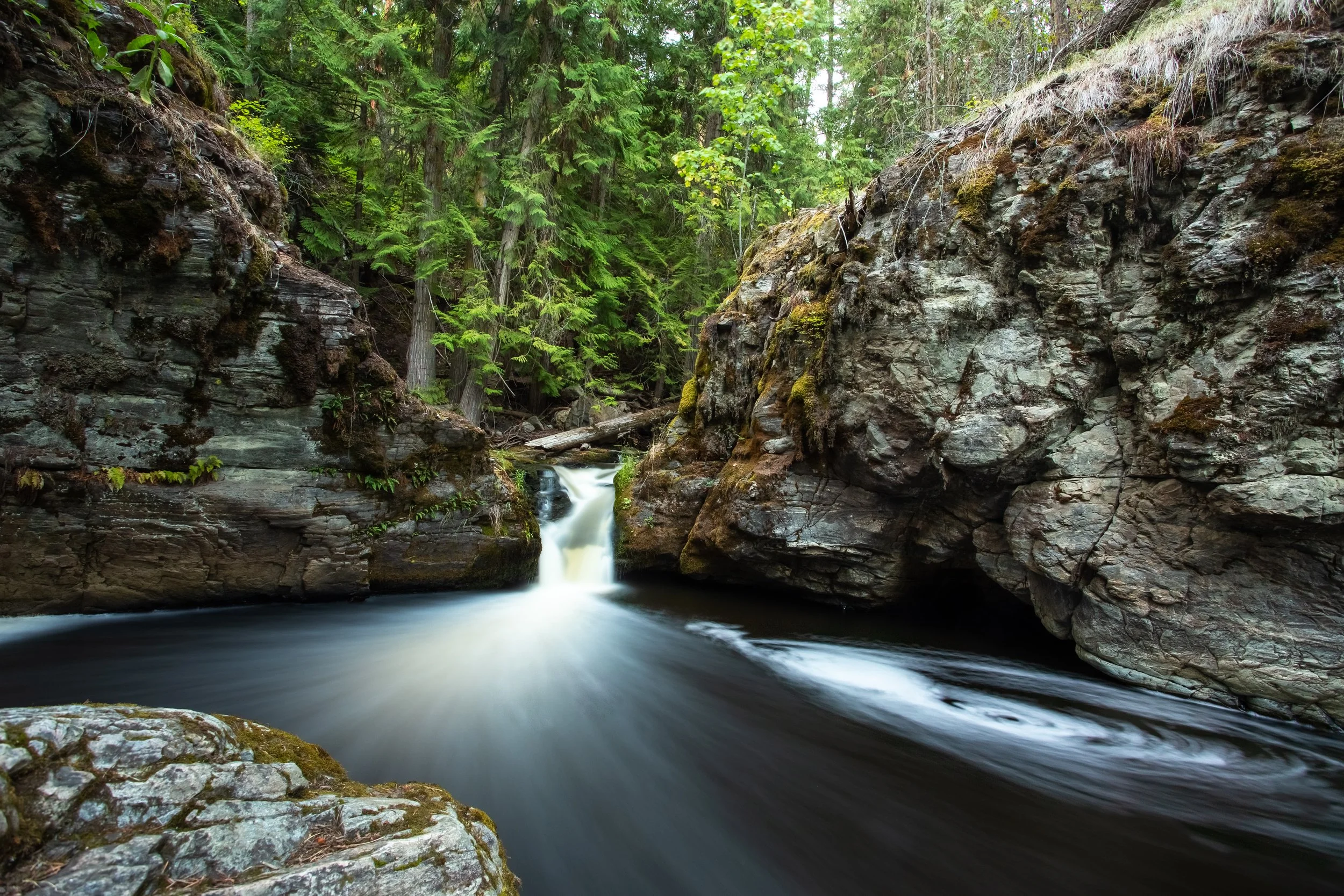 Small waterfall flowing into a rocky creek surrounded by lush green forest.